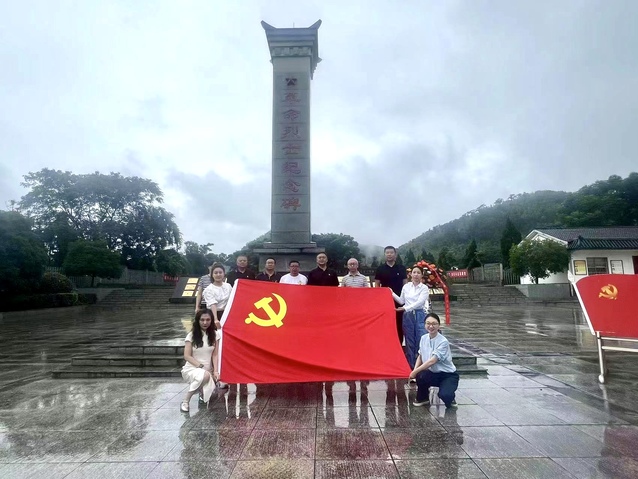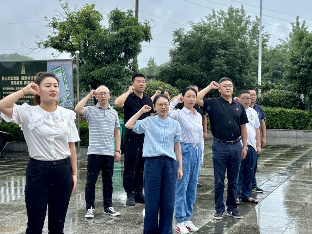 大雨中全体党员在烈士碑前齐唱国歌、肃立默哀、敬献花篮、重温入党誓词,深切表达对革命烈士的崇高敬意和无限敬仰之情。随后,全体党员在羊楼洞村委会党员活动室严格落实“规定动作”共同开展6月主题党日活动。会上,支部书记李立亚、王刚分别交流了党校学习情况,并结合部门业务工作谈了党纪学习体会,其他党员依次交流发言,分享学习心得。